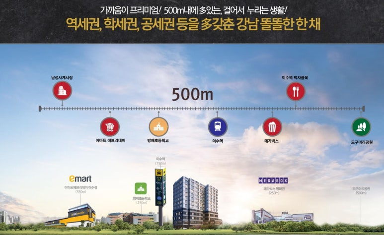 ▶ 메가박스, 이마트에브리데이 이수점 등 생활인프라 도보 이용 편리, 이수역 먹자골목, 방배동 카페골목을 걸어서 편리한 주거생활 영위, 남성사계시장, 남부종합시장 등 재래시장 이용 편리, 현충근린공원, 방배공원 등 도심속 그린 녹지 자연환경