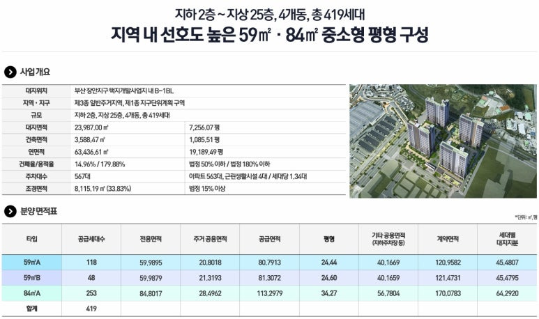 ▶ 부산 장안지구 택지개발사업지 내 B-1BL, 제3종 일반주거지역, 제1종 지구단위계획 구역 / 지하2층 ~ 지상25층(최고층) 총4개동 / 공동주택(아파트) 총419세대, 복리부대시설, 근린생활시설 등 공급예정