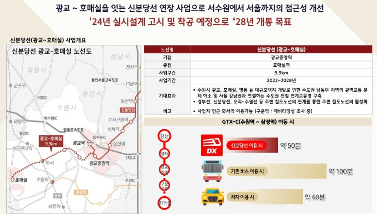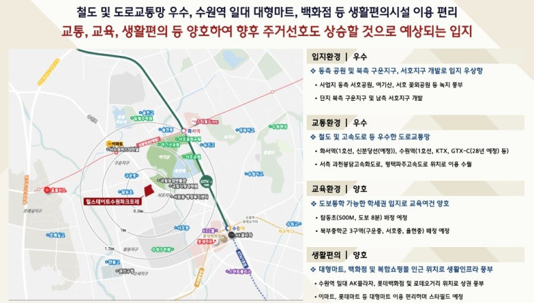 ▶ 당 사업지는 화서역(1호선, 신분당선(예정)), 수원역(1호선, ktx, gtx-c(28년 예정)노선 등) 역세권 입지로 대중교통을 통해 서울, 광역도시로 이동이 편리, 사업지 서측 과천-봉담고속화도로, 평택파주고속도로 등 자차를 통한 광역도시로 이동이 수월 한 입지