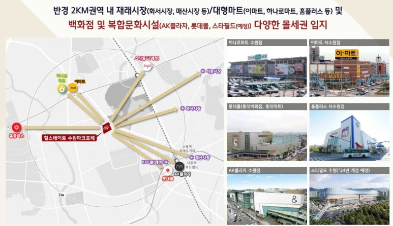 ▶ 사업지 인근 대형마트, 백화점 , 복합쇼핑몰 위치, 수원역 일대 AK플라자, 롯데백화점, 로데오거리, 이마트, 롯데마트 등 대형 마트 백화점 스타필드(예정) 생활 인프라 이용이 우수한 입지