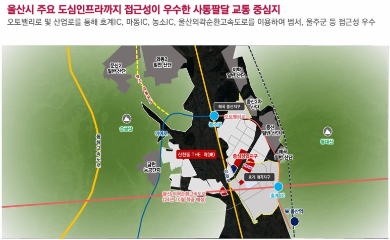 ▶ 농소-외동국도(예정), 북울산역 동해선광역전철(예정), 울산외곽순화도로(예정)등, 산업로, 오토밸리로, 이외 완전개통, 7번국도등 광역교통 인프라