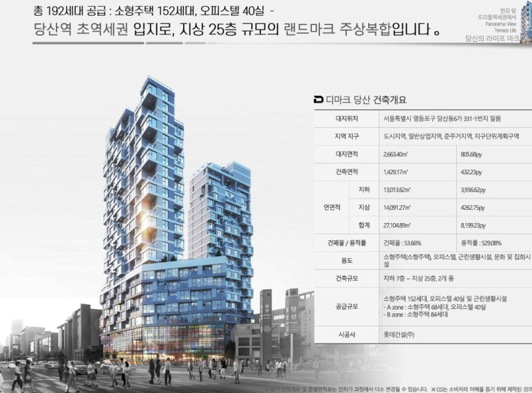 ▶ 서울특별시 영등포구 당산동6가 331-1번지 외 일원 / 지하7층 ~ 지상25층(최고층) 총2개동 / 공동주택(아파트) 152세대, 주거용 오피스텔 40실, 복리부대시설, 근린생활시설 등 공급