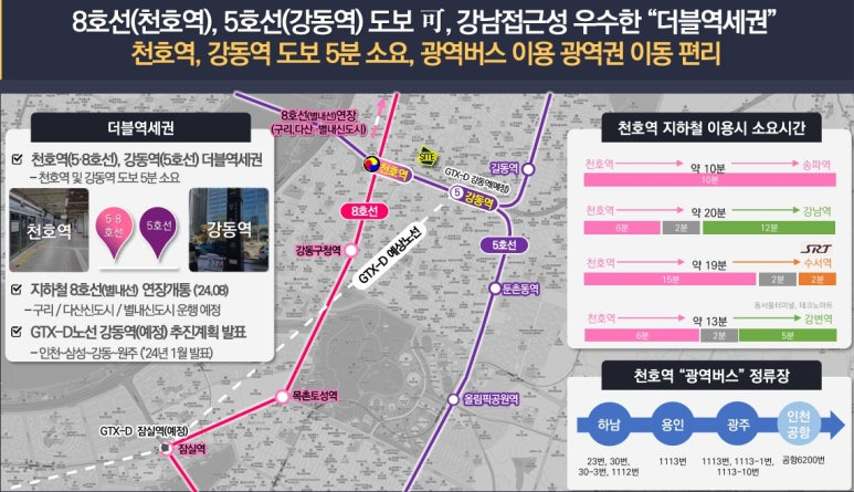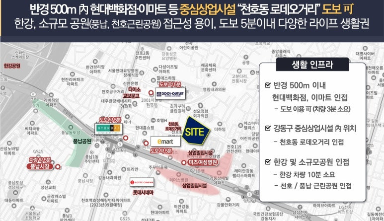 ▶당 사업지는 8호선 천호역, 5호선 강동역 도보권 역세권 입지로 대중교통을 통한 서울 시내.외 빠르고 편리한 이동 가능한 입지, 천호대로, 올림픽대로, 천호ic,세종-포천고속도로 등을 통해 서울 시내.외 광역도시로 이동이 편리한 사통팔통 편리한 교통망