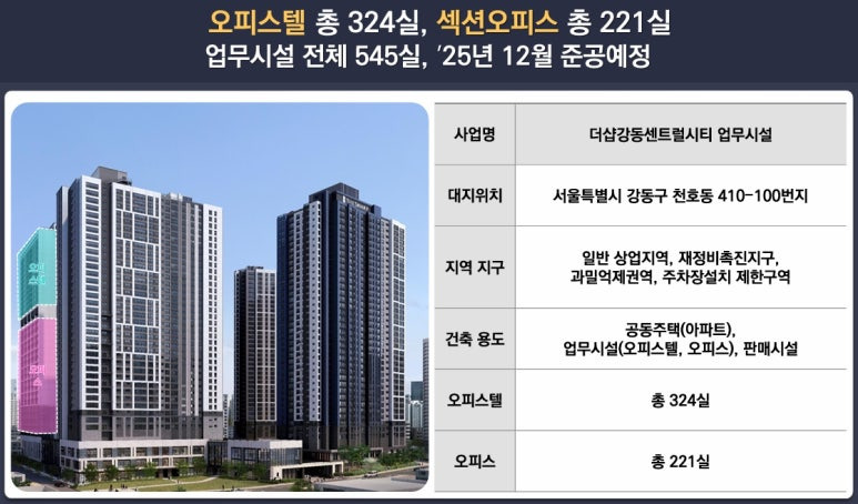 ▶서울특별시 강동구 천호동 410-100번지 외 일원 / 공동주택(아파트), 업무시설(오피스텔) 총324실, 업무시설(오피스) 총221실, 복리부대시설, 근린생활시설 등 공급예정