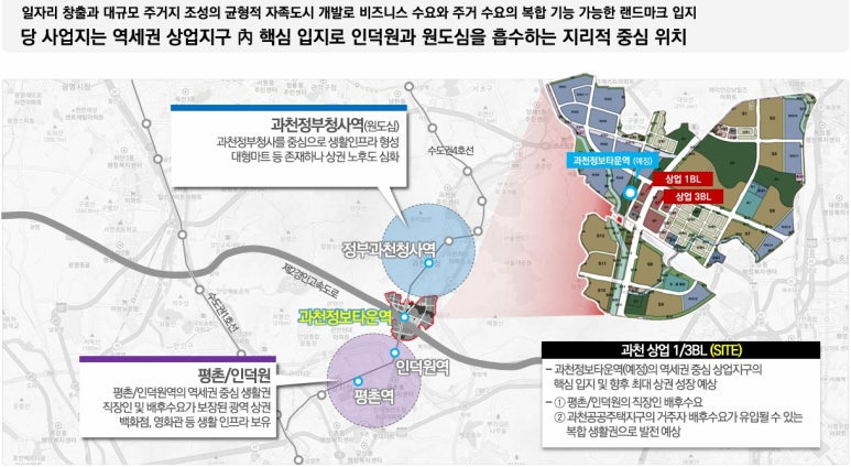 ▶ 당 사업지는 역세권 상업지구 내 핵심 입지로 인덕원과 원도심을 흡수하는 지리적 중심 위치로 향후 일자리 창출과 대구모 주거지 조성의 균형적 자족도시 개발로 비즈니스 수요와 수요의 복합 기능 가능한 랜드마크 최우수 입지