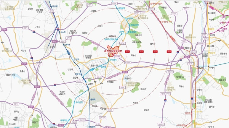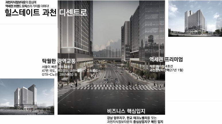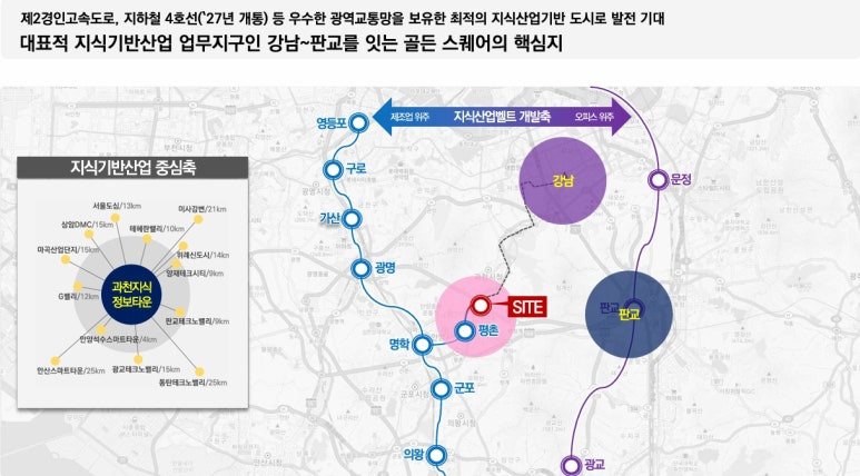 ▶ 당 사업지는 제2경인고속로, 지하철4호선 과천정보타운역(27년 개통예정)으로 우수한 광역교통망을 보유한 최적의 지식산업기반 도시로 발전 기대 입지로 대표적인 지식기반산업 업무지구인 강남 - 판교를 잇는 골든 스퀘어의 핵심지