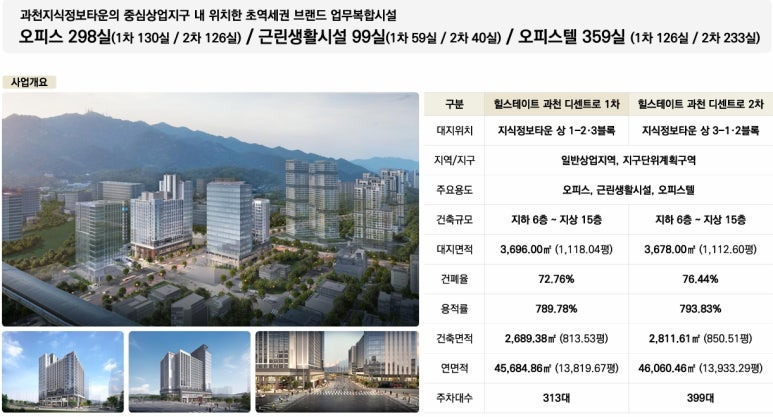 과천 지식정보타운 상 3-1.2블록 / 지하6층 ~ 지상15층 총1개동 / 오피스텔, 오피스 126실, 근린생활시설, 복리부대시설 등 공급예정