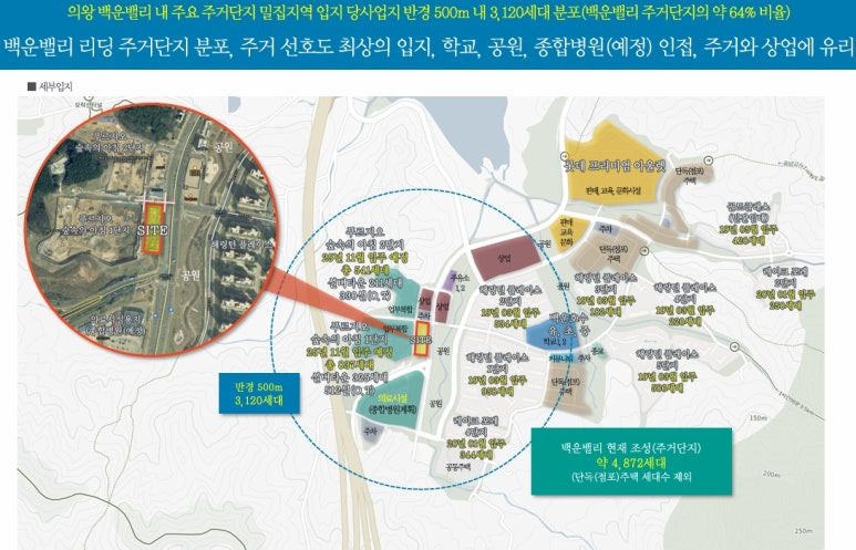 ▶ 의왕 백운밸리 내 주요 주거단지 밀집지역 입지 당 사업지 반경 500m 내 3,120세대 분포, 백운밸리 주거 선호도 최상의 입지, 학교, 공원, 종합병원(개원예정) 인접으로 주거와 상업에 유리한 입지
