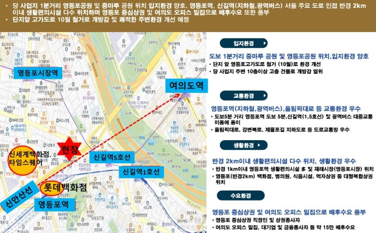 ▶ 당 사업지는 도보5분거리 영등포역 신길역 역세권, 광역버스 등 대중교통을 통한 시내.외 빠르고 편리한 이동 교통망, 올림픽대로, 강변북로, 제물포길 지하도로 등을 통한 자차 이용 편리한 교통망 우수한 입지