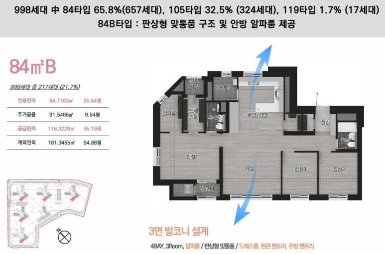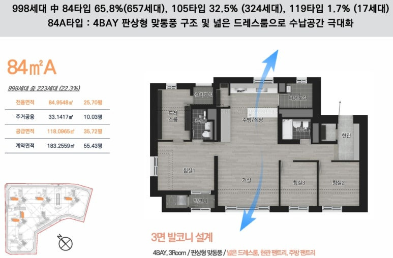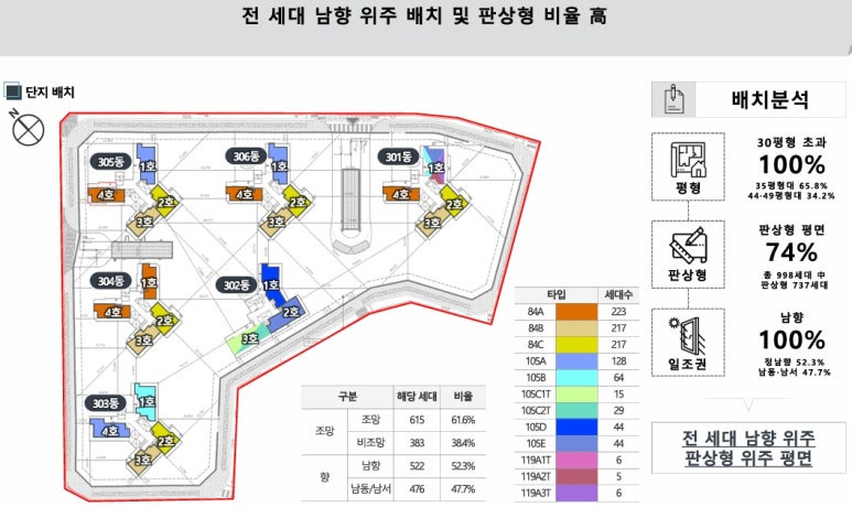 배치, 전세대 선호도 높은 남서향, 남동향 호실을 중심 배치하여 쾌적한 주거 환경 영위