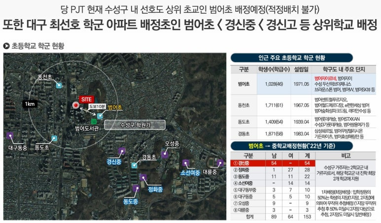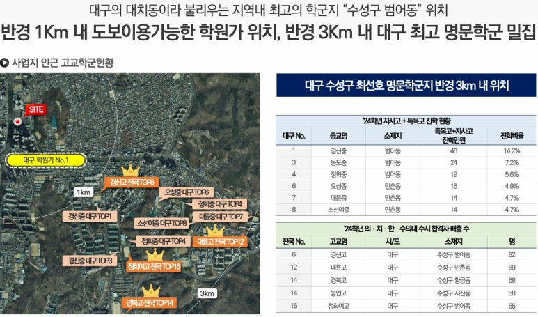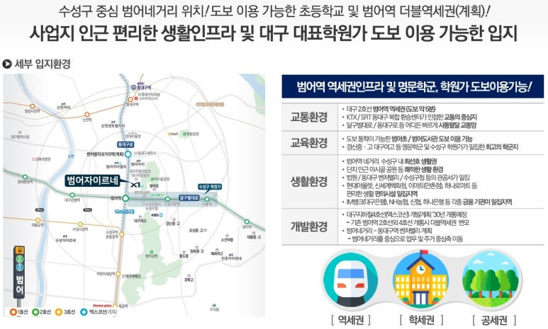 ▶ 사업지는 범어초 안심 안전한 도보통학이 가능한 교육환경 입지, 경신중, 고대구여고 등 명문학군 및 수성구 사설 학원가가 밀집한 최고의 학군지, 범어도서관 도보 이용가능