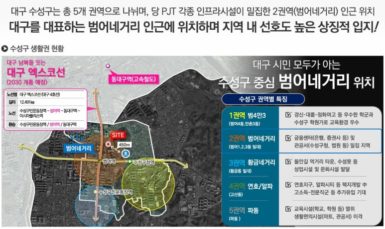 ▶ 당 사업지는 대구2호선 범어역 도보5분거리 역세권 입지, ktx, srt 동대구 복합 환승센터가 인접한 교통의 중심 입지, 달구벌대로, 동대구로 등 어디든 빠른게 사통팔달 광역교통망