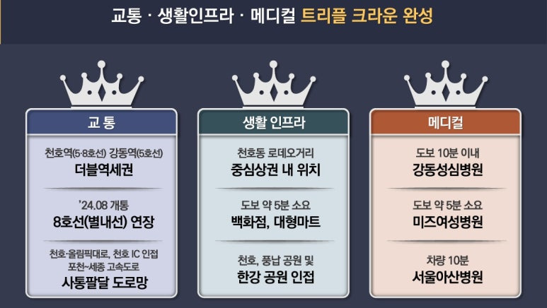 ▶당 사업지는 8호선 천호역, 5호선 강동역 도보권 역세권 입지로 대중교통을 통한 서울 시내.외 빠르고 편리한 이동 가능한 입지, 천호대로, 올림픽대로, 천호ic,세종-포천고속도로 등을 통해 서울 시내.외 광역도시로 이동이 편리한 사통팔통 편리한 교통망