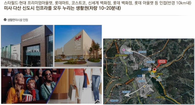 ▶ 사업지는 롯데마트, 하남 스타필드, 현대프리미엄아울렛 등 대형 쇼핑, 마트등 생활인프라 이용 매우 우수한 입지 또한 남측 상업지역 형성으로 생활환경 편리한 입지