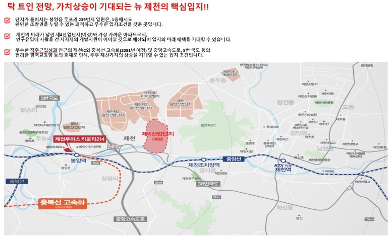 ▶ 당 사업지는 인근 제천ic와 충북선 고속화(2031년 예정), 중앙고속도로, 5번 국도등의 편리한 광역교통망 이용 주변 광역도시 수도권 이동이 편리한 입지