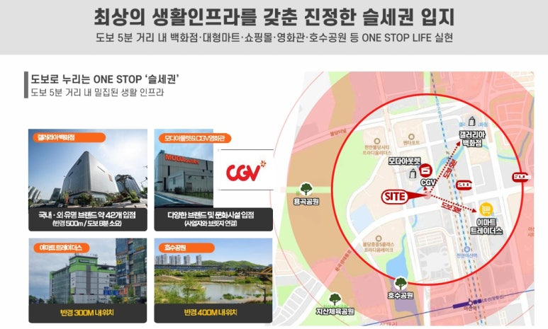 ▶ 사업지는 갤러리아백화점, 이마트, 이마트 트레이더스 등 각종 생활 인프라 밀집 또한 천안아산역 인접 상업지역 내 다양한 근린생활시설 형성, 단지 인접 호수 공원 및 지산체육공원 위치, 일대 아산신도시개발로 인프라 및 쾌적한 주거여건 입지