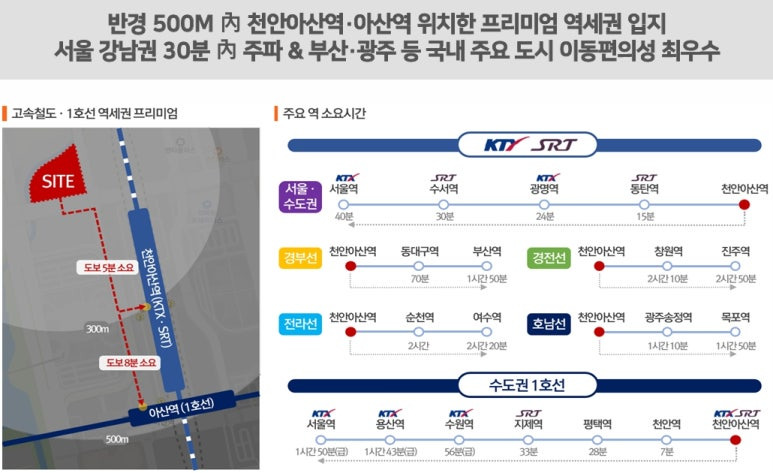 ▶ 당 사업지는 천안아산역 ktx, srt, 1호선 반경 300m 내 위치한 역세권 입지, 단지와 연결되는 브릿지를 통해 천안아산역 접근용이 철도와 지하철을 이용한 대중교통으로 서울 이동이 빠르고 편리, 경부고속도로 천안ic 인접, 당진 - 천안 고속도로(25년 개통예정) 탕정ic 인접